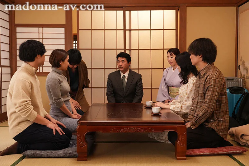 まずね、最初のチェックインのシーンから空気が妙に生々しいの。旦那同士は「まあ仕方ないですね」なんて言いながらも、お互いの奥さんをチラチラ見てるし、人妻たちも気まずそうにしながら内心ドキドキしてる感じがリアル。